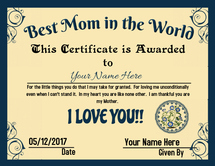 Amazon Com Worlds Best Mom Certificate Award Custom Printed By Us With Any Name Date 8 5 By 11 Inches 100 Real Looking Free Certificate Folder Office Products