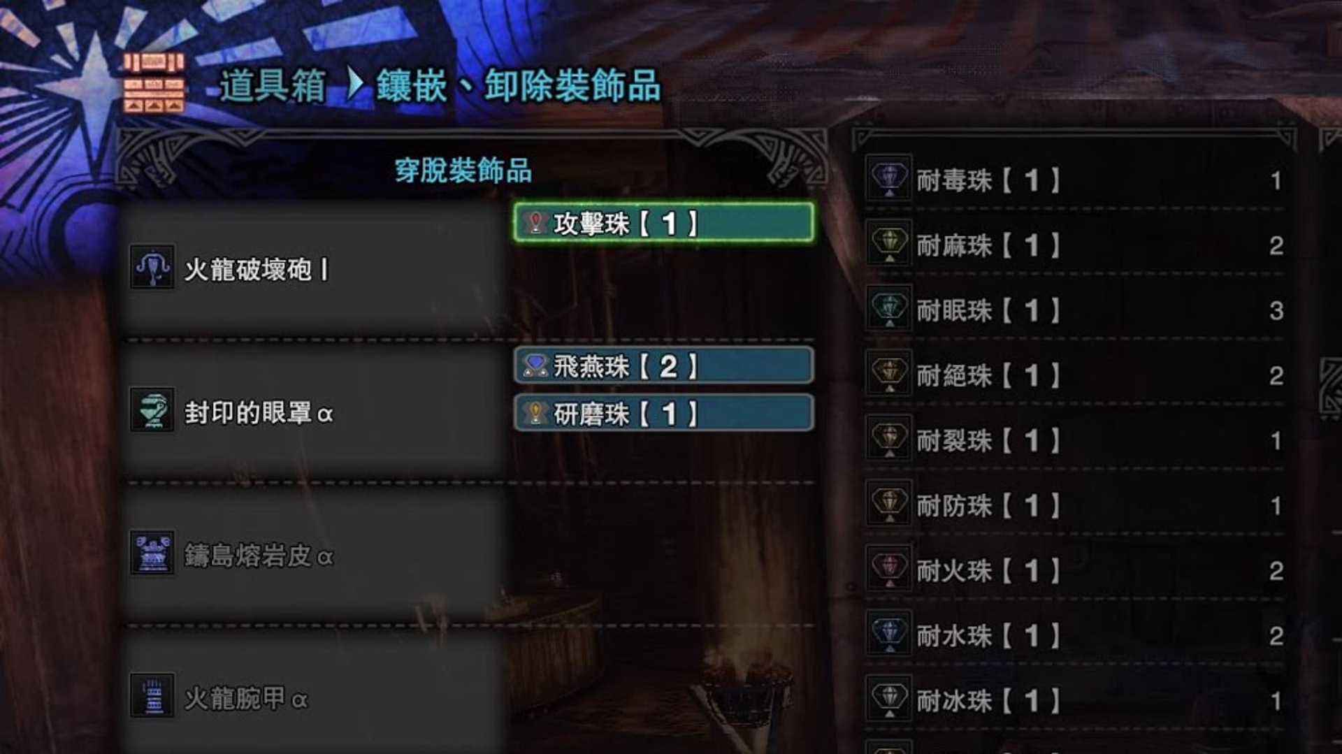 魔物獵人系列最新作 monster hunter world/mhw 的中文版攻略維基。武器、裝甲、魔物、道具、技能、任務、地圖等,不停更新最新資料的數據庫!. ===== 稀有度5装饰品表: 装饰珠 镶嵌等级 稀有度 对应技能 技能最高等级 耐毒珠 1 5 毒耐性 3 耐麻珠 1 5 麻痹耐性 3 耐眠珠 1 5 睡眠耐性 3 耐爆珠 1 5 爆破异常状态的耐性 3 耐裂珠 1 5 裂伤耐性 3 耐防珠 1 5. Reply Post by dtlnor ( 16:13):.